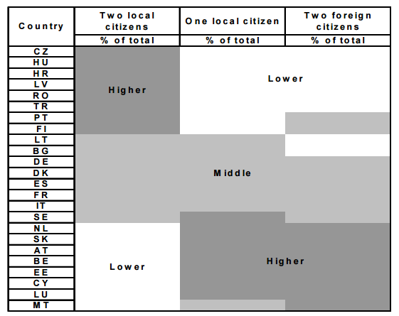 Tuttavia, per quanto i nazionalisti si sforzino di sottolineare, marcare ed evidenziare le sempre più sbiadite linee che rendono uno stato diverso dall'altro, tale affinità è sempre più impalpabile. Non solo perché non vengono riconosciute come tali da parte delle popolazioni, ma perché persino l’affinità di sangue comincia a vacillare. C’è un trend crescente fra i matrimoni fra cittadini EU provenienti da nazioni diverse [fonte]. La statistica è aggiornata solo al 2006 ma non mi sorprenderebbe affatto che il trend sia continuato. Solo nella mia ristretta cerchia di conoscenze (che non è statisticamente rilevante, ma può far riflettere), negli ultimi 2–3 anni ho contato 6 matrimoni fra persone di nazionalità italiana-inglese, e 3 italiana-spagnola.