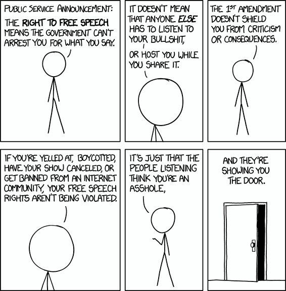 In parole povere, la libertà di dire ciò che si vuole implica solamente che il governo (o le autorità di cui al punto 1) non possono arrestare un individuo per quello che dice o per le sue proprie opinioni. Non significa, invece, che ciò che si dice o le proprie opinioni abbiano il diritto ad essere trattate alla pari di tutte le altre. La scelta di come trattare quest’ultime (accettarle, dibatterle, o semplicemente ignorarle) è nelle mani dei privati (individui, società, gruppi o associazioni). Non esiste nessun diritto di piattaforma (salvo rare specifiche eccezioni quali le leggi di par condicio che, tuttavia, sono sempre ben delimitate).